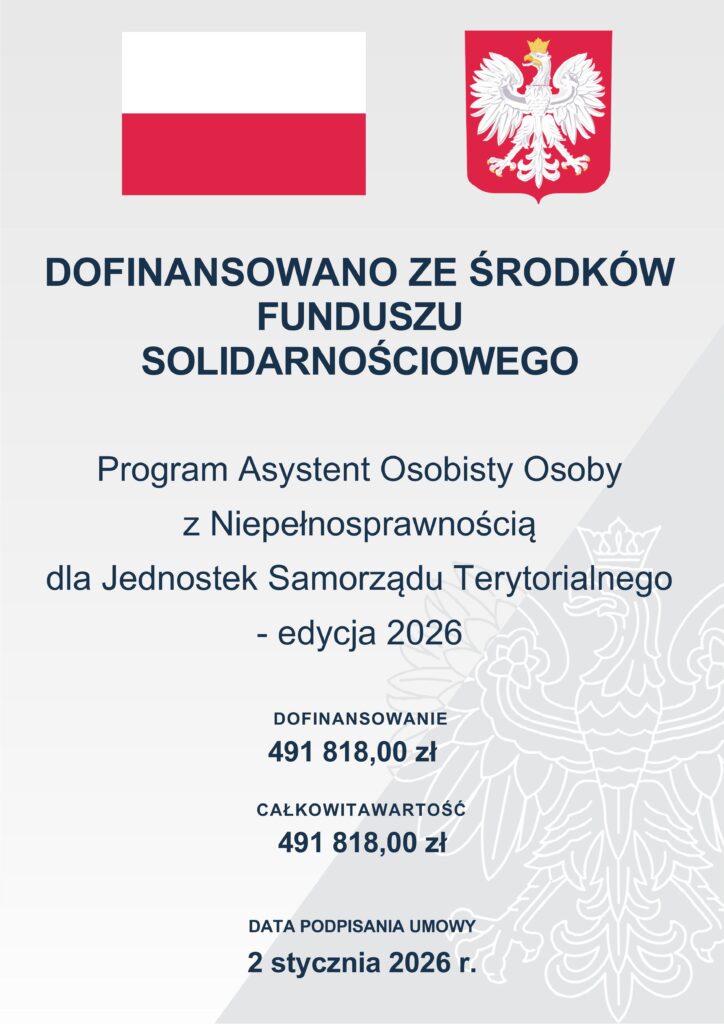 Gminny Ośrodek Pomocy Społecznej w Stryszowie informuje, iż Gmina Stryszów pozyskała środki finansowe z Funduszu Solidarnościowego w wysokości 491 818 zł na realizację Programu resortowego Ministra Rodziny, Pracy i Polityki Społecznej  Asystent osobisty osoby z niepełnosprawnością dla Jednostek Samorządu Terytorialnego – edycja 2026.