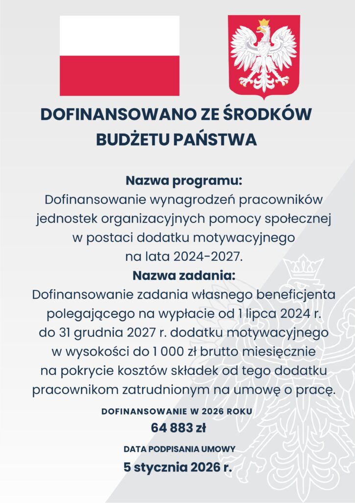 Nazwa zadania: dofinansowanie zadania własnego beneficjenta polegającego na wypłacie od 1 lipca 2024 r. do 31 grudni 2027 r. dodatku motywacyjnego w wysokości do 1 000 zł brutto miesięcznie oraz na pokrycie kosztów składek od tego dodatku, pracownikom zatrudnionym na umowę o pracę.